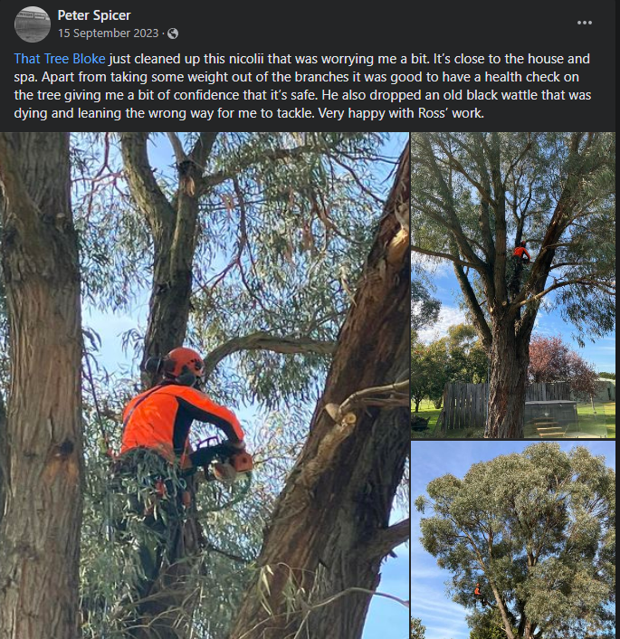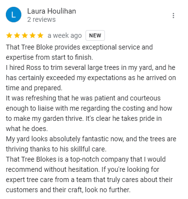 “I couldn’t be happier with the service provided by That Tree Bloke! From the initial consultation to the final cleanup, their team of qualified arborists was professional, knowledgeable, and incredibly efficient. They expertly pruned our overgrown trees and removed a hazardous one near our house, all while ensuring minimal disruption to our property. The difference in our landscape is remarkable, and we feel so much safer now. Highly recommend their services to anyone in need of top-notch tree care!”